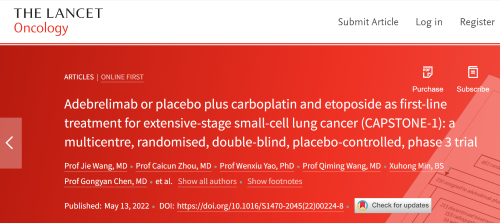 北京时间2022年5月14日,金年会医药自主研发的PD-L1抑制剂阿得贝利单抗治疗广泛期小细胞肺癌的III期临床研究(CAPSTONE-1研究)成果正式全文在线发表于国际权威学术期刊《柳叶刀·肿瘤学》(《THE LANCET Oncology》,影响因子41.316)。CAPSTONE-1研究结果显示,阿得贝利单抗联合化疗一线治疗广泛期小细胞肺癌相较于安慰剂联合化疗可以显著延长患者总生存期至15.3个月[1],刷新现有免疫药物一线治疗广泛期小细胞肺癌的总生存纪录[2]。