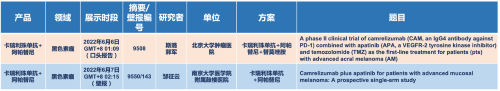在黑色素瘤领域,金年会医药的卡瑞利珠单抗联合阿帕替尼(“双艾”组合)在2022 ASCO共入选1项口头报告和1项壁报展示。