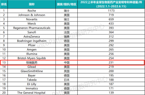 专利是药企最有价值的资产之一,是企业发展的基石,对做原创创新的企业尤为重要。全球专利数据库incoPat创新指数研究中心对2022年1月1日至2022年6月15日公开的全球生物医药产业发明专利申请数量进行统计排名,生物医药产业专利涉及生物技术药、基因工程药物、疫苗、诊断试剂、微生态制剂、血液制品等技术领域。入榜企业/医院主要来自13个国家、组织或地区,罗氏、强生、诺华分别位列前三,金年会医药(231件)排名第13位,领跑中国药企。