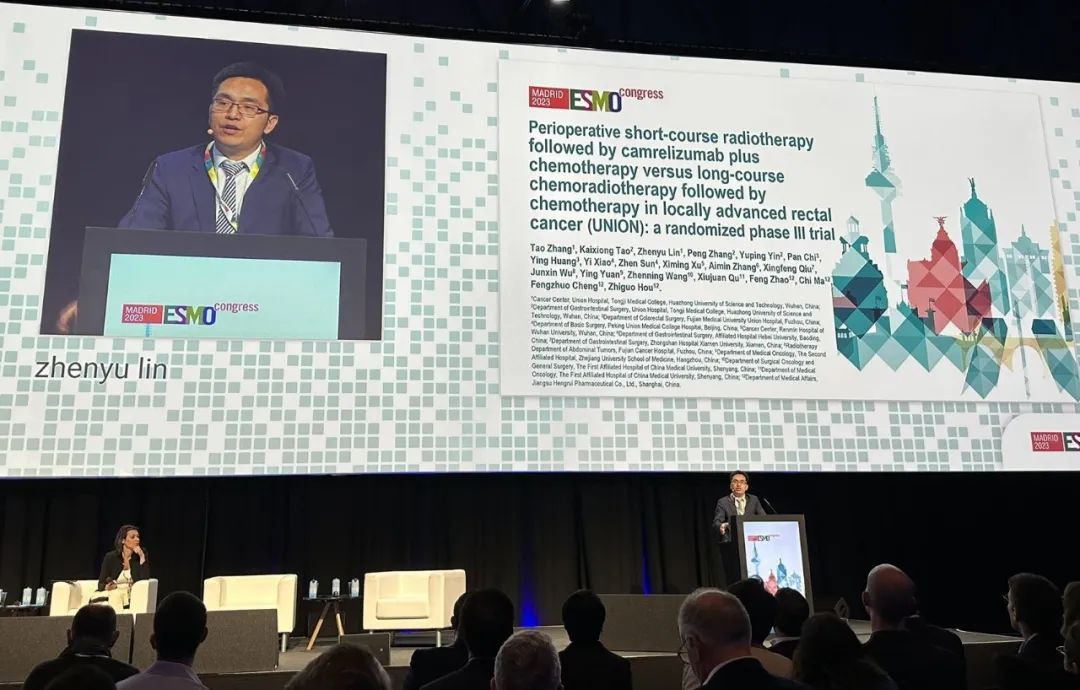 10月21日,金年会医药创新药卡瑞利珠单抗的一项研究“新辅助短程放疗序贯卡瑞利珠单抗联合化疗对比长程放化疗序贯化疗治疗局部晚期直肠癌”随机对照Ⅲ期试验(UNION)亮相2023 ESMO大会优选口头报告现场。该研究由华中科技大学同济医学院附属协和医院张涛教授、陶凯雄教授担任主要研究者,华中科技大学同济医学院附属协和医院林振宇教授在大会现场报告了该重磅研究的结果1。此项研究是全球首个评估短程放疗序贯免疫治疗联合化疗治疗局部晚期直肠癌的Ⅲ期研究,已达到主要终点病理完全缓解(pCR),有望为直肠癌患者的治疗提供新策略。